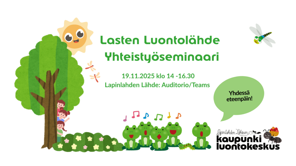 Jos haluat kuulla lisää Lasten Luontolähde -hankkeen havainnoista ja siitä, miten lasten luontosuhdetta voidaan tukea kaupunkiympäristössä, olet lämpimästi tervetullut Hyvinvointia lapselle luonnosta -seminaariin 19.11. Tilaisuudessa esittelemme hankkeen tuloksia, jaamme käytännön menetelmiä sekä etsimme yhteistyön paikkoja eri luontotoimijoiden välille. Tilaisuus alkaa Lapinlahden auditoriossa klo 14 (-16.30), ja siihen voi osallistua myös etänä Teamsissä.