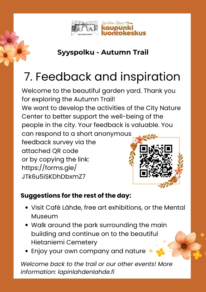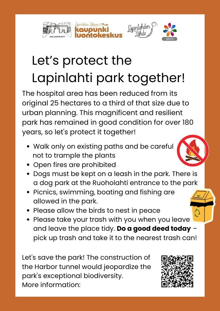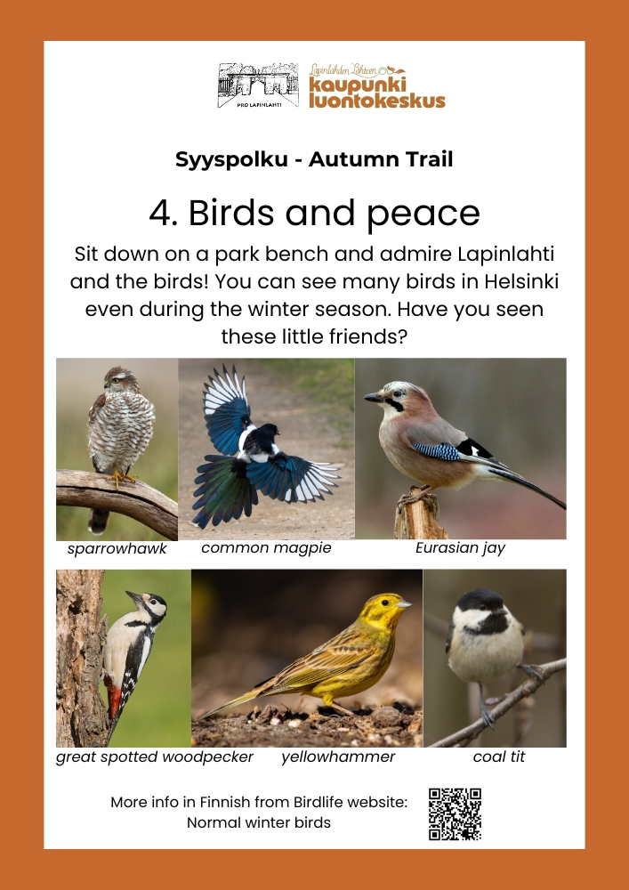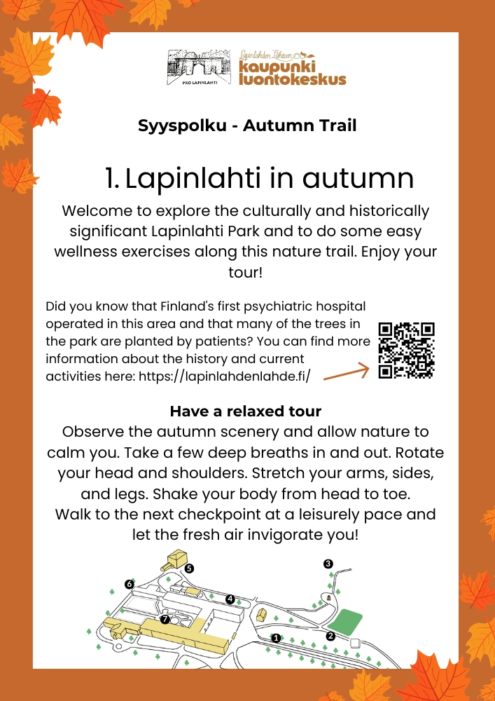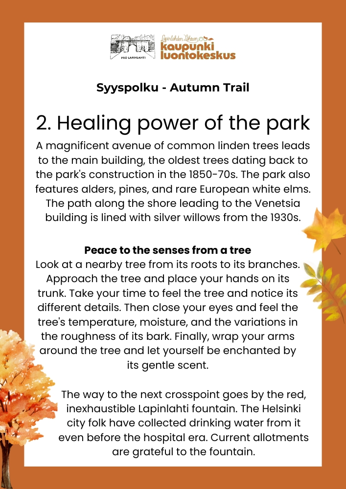Over the years, many nature trails have been designed for Lapinlahti Park. This year, the Lapinlahden Lähde City Nature Center has come up with ideas for the Spring Trail, Summer Trail, and most recently, Autumn Trail. Ilona will present the new trail in the Lapinlahti Park on Tuesday October 21st at 1pm–2.30pm. Join us and enjoy the wonderful autumn colors! Come and explore the Autumn Trail!