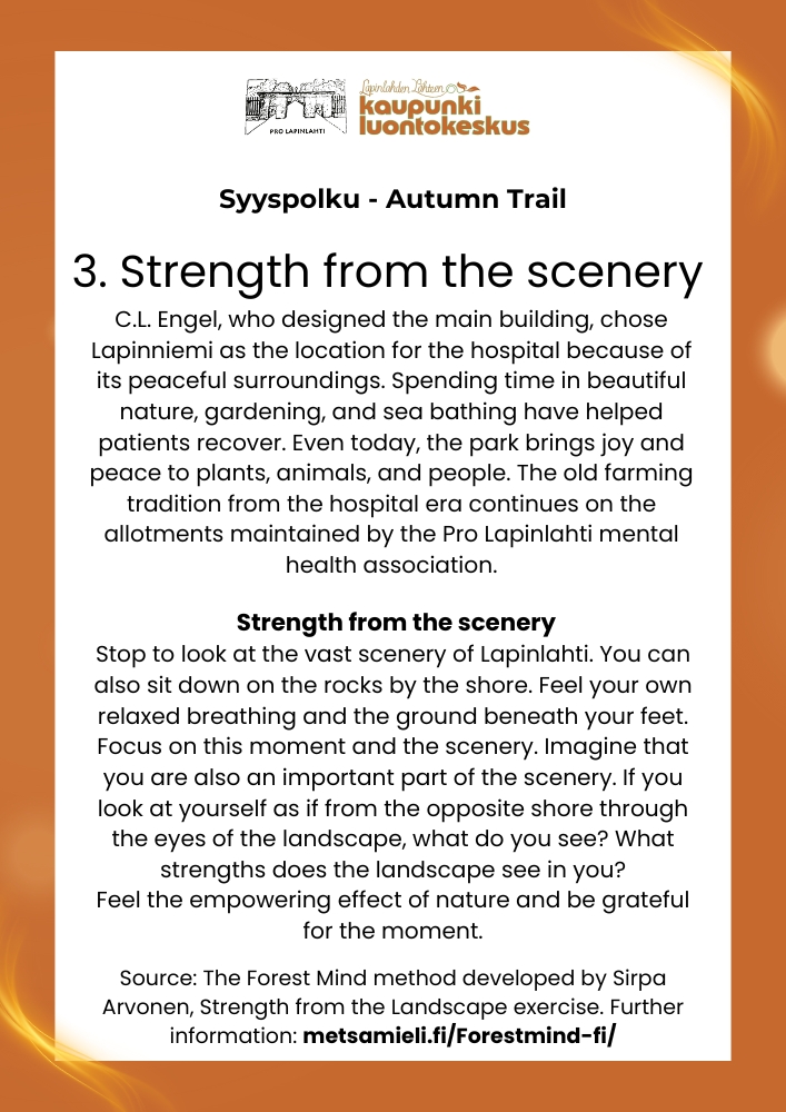 You can find the map in this article or at the first checkpoint along the park’s linden tree alley leading to the main building. You can also borrow a laminated map from Café Lähde, but remember to return it when you are done. More information about the trail can also be found on our website.