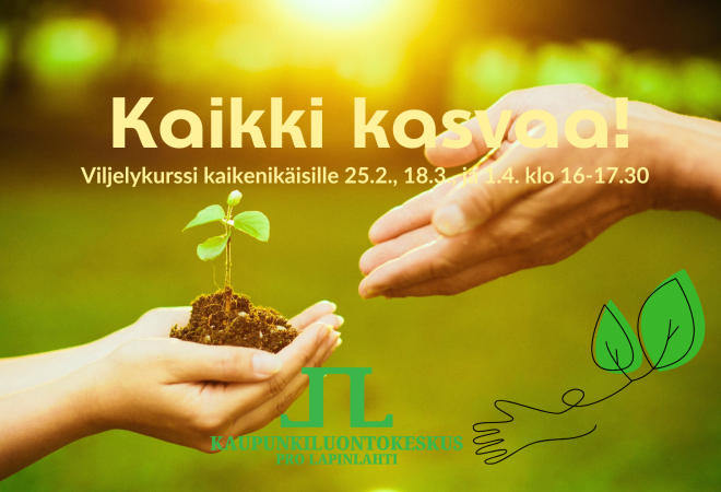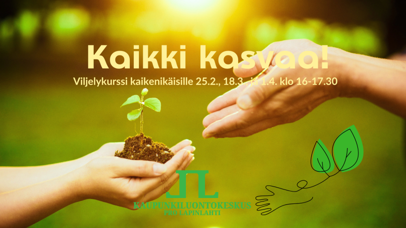 Kaikki kasvaa! Viljelykurssi kaikenikäisille. Opitaan taimikasvatusta, ruukku- ja parvekeviljelyä jne. Jokaisella kerralla kylvetään tai istutetaan jotain kotiin viemiseksi. Kurssi on kaikenikäisille, lapsille, vanhemmille, isovanhemmille. Voit tulla myös ilman lasta. Paikkoja max 12 hengelle. Lapsille on varattu myös muuta tekemistä eli he saavat osallistua kiinnostuksensa mukaan.Voit osallistua kaikkiin kertoihin tai vain yhteen joustavasti.