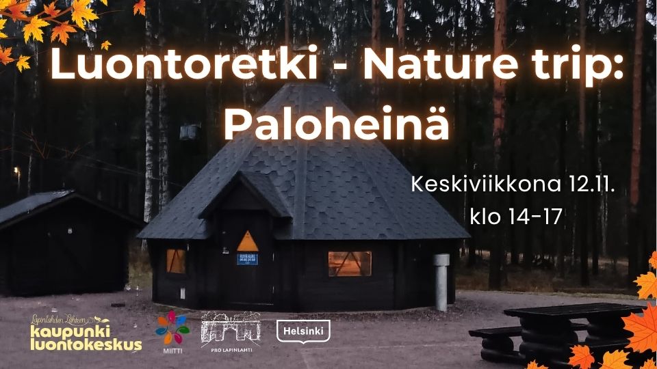 Vietetään yhdessä mukava iltapäivä Paloheinässä ihaillen ja virkistyen loppusyksyn luonnosta! Paloheinän ulkoilualue tarjoaa paljon erilaisia luontoaktiviteetteja osana Keskuspuistoa. Alueella on myös merkittävä 137 hehtaarin Haltialanmetsän luonnonsuojelualue. Retken lopuksi tunnelmoidaan ja grillaillaan Paloheinän kodalla, eli mukaan kannattaa ottaa omaa grillattavaa. Lisäksi voit osallistua kodalla vapaamuotoiseen pajaan, jossa tehdään lankaa nokkosesta ja lehmuksesta! Retki on kaikille avoin ja ilmainen, lankapajaan osallistuville pieni kahden (2€) euron materiaalimaksu käteinen/Mobilepay.