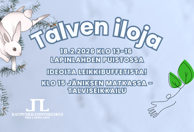 Voit lähteä puistojänön jäljissä liikunnalliseen talviseikkailuun (lähtö lipputangon luota klo 15), pysähtyä lumen lumoihin, poimia inspiraatiota talven tieto- ja leikkibuffetista ja viettää vapaasti aikaa talvisessa Lapinlahdessa. Leikkibuffet sijaitsee sairaalarakennuksen etupuolella.