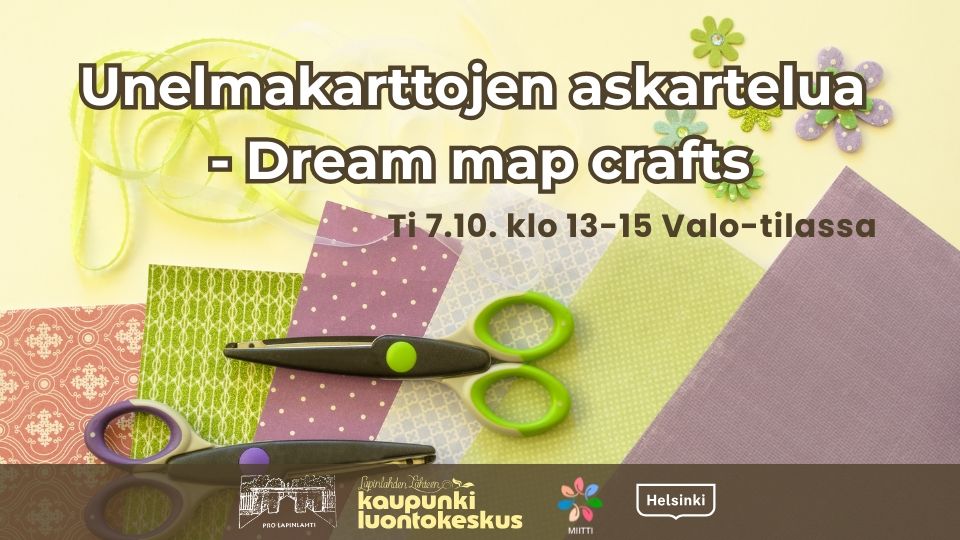 Tule tekemään unelmakarttaa viihtyisään Valo-tilaan Lapinlahden Lähteellä. Voit käyttää aikakauslehtiä, värikkäitä kartonkeja ja muita koristeita. Ihmetellään yhdessä erilaisia kuvia, sanoja ja värejä! Paja on kaikille avoin ja ilmainen. Halutessasi voit tukea toimintaamme pienellä materiaalimaksulla paikan päällä. Paja pyörii tiistaina 7.10. klo 13-15 non-stop-periaatteella ja ilmoittautumista ei tarvita, paitsi isommat ryhmät mielellään kysely etukäteen [email protected]. Pajaan mahtuu kerrallaan maksimissaan 14 henkilöä.