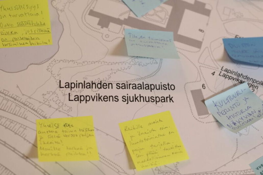 - – Mielenterveystoiminta ja taiteilijat. Lapinlahden alueella on ainutlaatuinen joukko pieniä matalan kynnykset mielenterveystoimijoita sekä taiteilijoita. Tämän kaltaisille toiminnoille halutaan jatkossakin taata toimintamahdollisuudet. Osallistujat saivat vastata seuraaviin kysymyksiin: